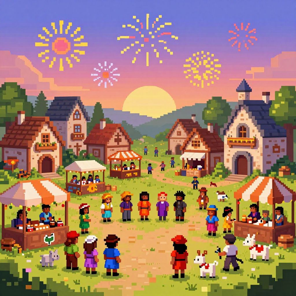 Pixel art gen presenting a medieval village festival with pixel villagers in colorful clothing, market stalls, pixel fireworks in the sky, lively pixel animals, detailed architecture in pixel style, warm sunset lighting, joyful and bustling atmosphere.