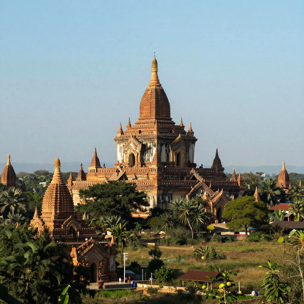 Photograph of a sunlit, ancient temple complex with numerous golden-brown, dome-shaped structures scattered across a lush, green landscape. The largest temple is centrally located, surrounded by smaller pagodas and dense trees. The clear blue sky in the background contrasts with the warm hues of the temples and the greenery below. The image has a slight vignette effect.