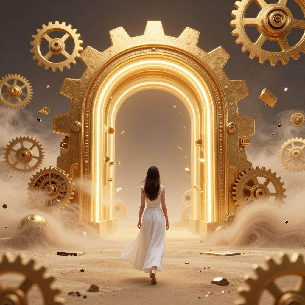 A surreal 3D-rendered scene depicts a woman in a flowing white gown walking toward a massive, golden, gear-like archway that glows with ethereal light, surrounded by floating mechanical cogs and swirling sandstorms, evoking a dreamlike, cyberpunk-inspired fantasy world where paradoxical geometries and memory fragments converge.