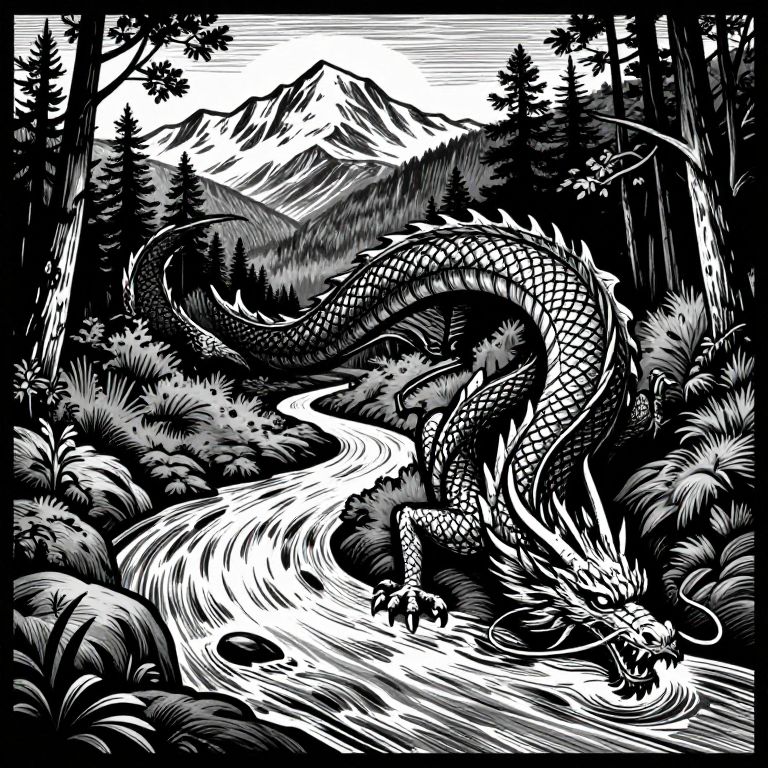 The image is a striking black and white woodcut illustration featuring a dragon transforming into a river. The dragon, with its scales and spines, is depicted in a dynamic, sinuous form that seamlessly blends into the flowing water. The river winds through a lush, forested landscape, with dense foliage and trees framing the scene. In the background, majestic mountains rise, their peaks covered in snow, creating a stark contrast with the dark foreground. The interplay of light and shadow, along with the intricate details of the dragon's scales and the river's ripples, adds depth and texture to the composition. The overall arrangement of elements creates a sense of movement and transformation, with the dragon's body curving gracefully into the river, blending natural and mythical elements in a harmonious and visually captivating manner.