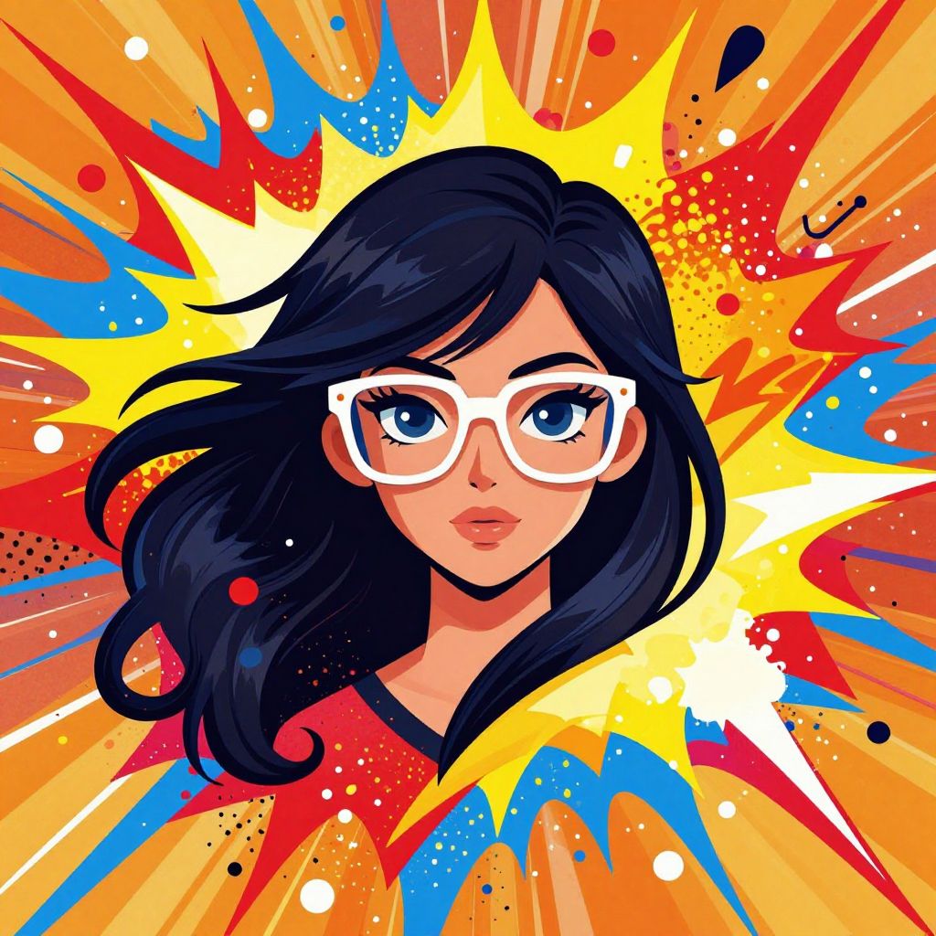 Digital pop art illustration of a young woman with medium skin tone, black wavy hair, and blue eyes. She wears white rectangular glasses and a red top. The background features a vibrant explosion of orange, yellow, red, and blue rays with white splatters, creating a dynamic and energetic effect. The woman's expression is calm and confident, with a slight smile. The image is highly stylized, reminiscent of comic book art, with bold colors and sharp lines.