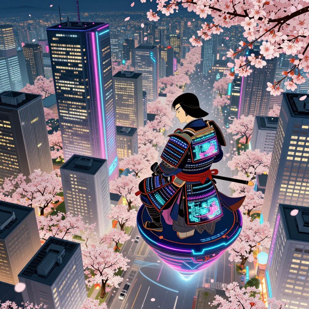 Craft an image that combines the lively energy of Japanese ukiyo-e woodblock prints with futuristic elements. Depict a cityscape featuring towering skyscrapers illuminated by vibrant neon lights, juxtaposed against cherry blossom trees in their radiant bloom. From a unique aerial viewpoint above this blend of ancient and modern architecture, focus on a solitary samurai warrior perched upon a levitating platform. The warrior's traditional armor is adorned with intricate designs resembling advanced technology, featuring glowing circuits and holographic patterns that mirror the vivid colors of the sakura petals. This harmonious fusion of ancient culture and high-tech innovation evokes a captivating emotional spectrum, mesmerizing viewers with its enchanting blend of wonder, nostalgia, and admiration for the elegance of contrasts in this alluring urban fantasy setting.