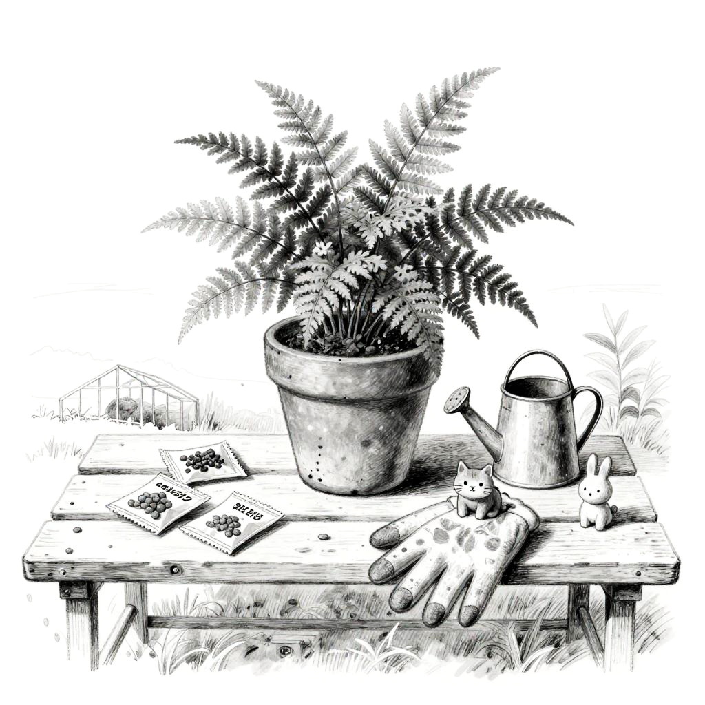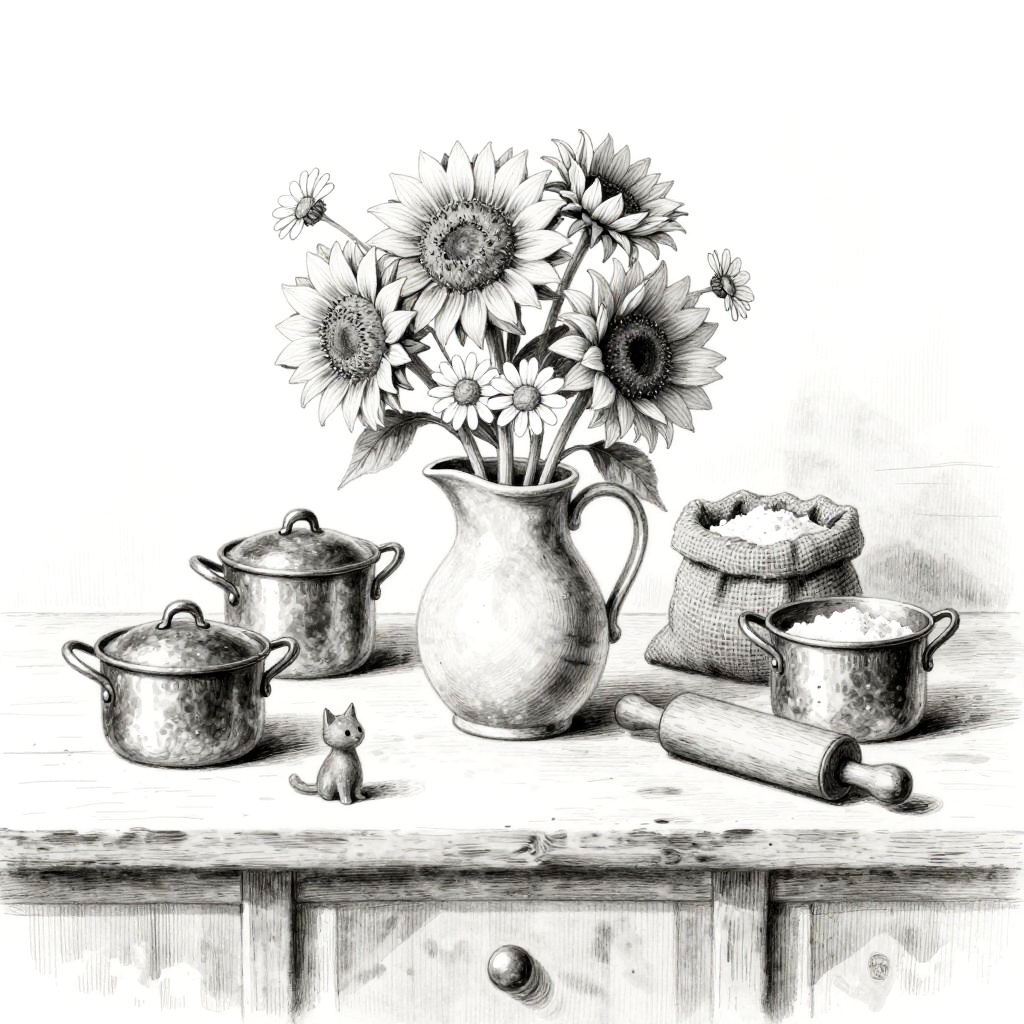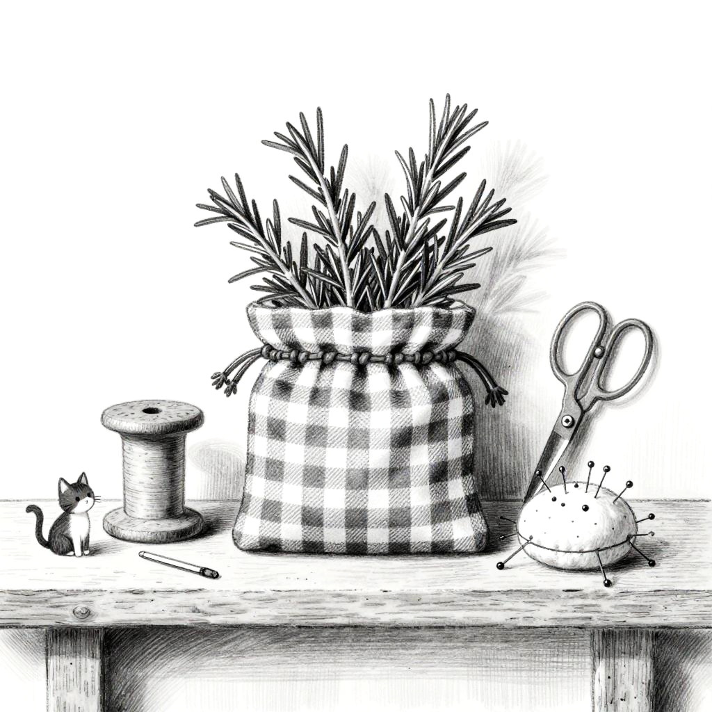 Black-and-white, whimsical hand-drawn still life on a quaint sewing nook shelf, centered on gingham fabric pouch with sprigs of herb rosemary. Arranged around it: wooden spool rack, antique scissors, pin cushion. Tiny figurines of a cat and a rabbit add charm. Background is minimal, a few lines suggesting a wall and horizon. Soft shading, gentle crosshatching, delicate line art, balanced negative space, subtle paper grain, calm studio light, sketchbook aesthetic.
