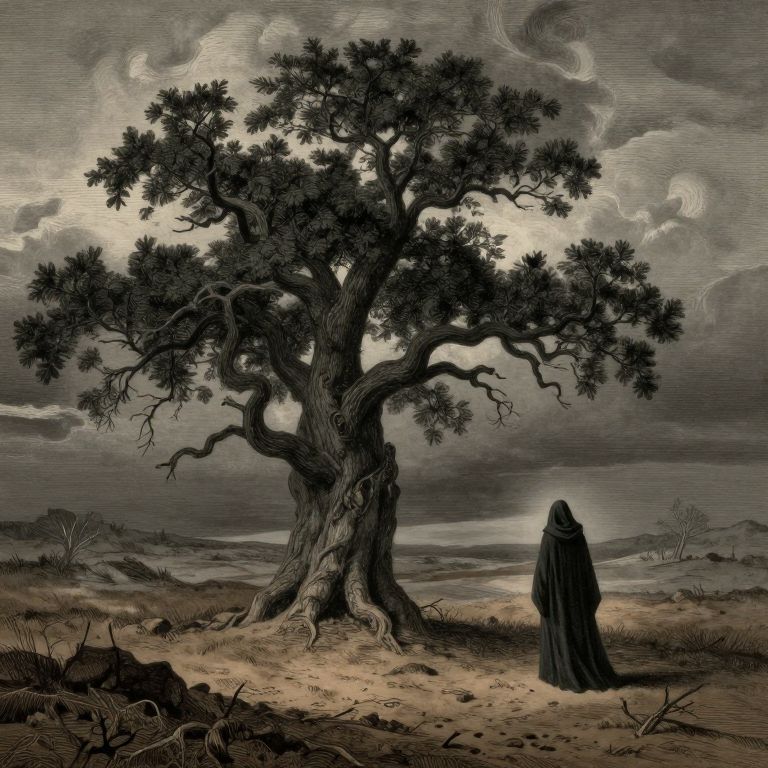 Digital illustration of a lone, hooded figure standing before a twisted, dark tree in a desolate, stormy landscape. Gray, ominous sky.