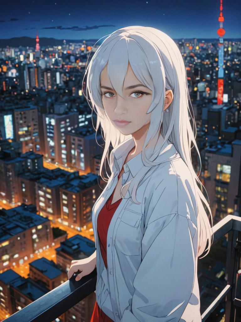 Anime visual young long - white - hair red - eyed girl sightseeing above the city at night from apartment balcony interior, guardrail, cute face ilya kuvshinov, makoto shinkai, kyoani, masakazu katsura, dynamic pose, crisp and sharp, yoshinari yoh, glossy rounded eyes, anime poster