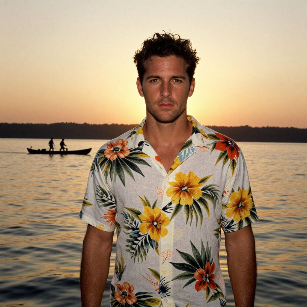 A man, short-sleeve Hawaiian shirt, vibrant floral print, lightweight cotton, relaxed vibe, golden sunset, tranquil ripples, silhouetted canoe gliding across the lake, ektachrome film stock, serene expression Man has masculine face and piercing eyes