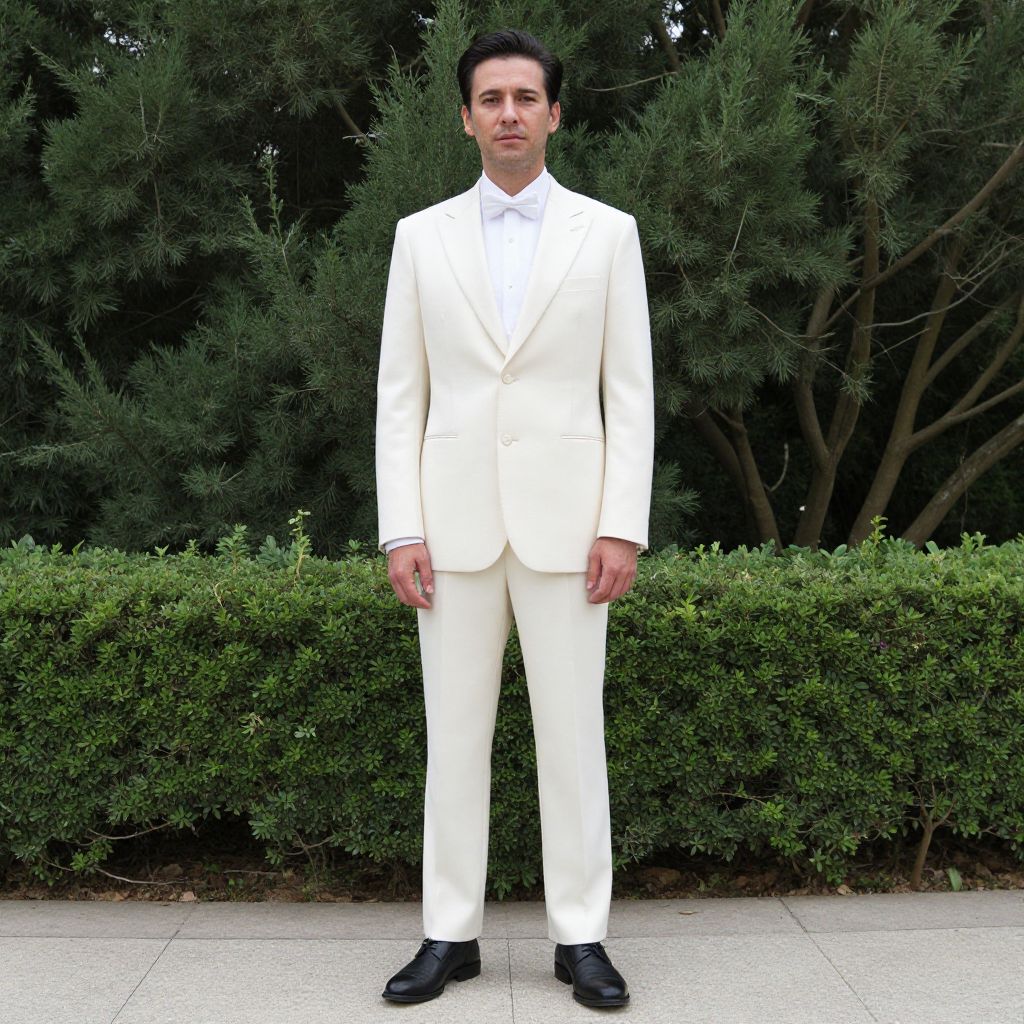 Photograph of a tall, middle-aged man with short, dark hair, standing confidently in front of a lush, green bush and tall, dark trees. He is wearing a crisp, white, single-breasted suit with a white dress shirt and no tie, paired with black dress shoes. The man has a medium build and a serious expression. The background consists of dense, green foliage, creating a natural, outdoor setting. The pavement beneath him is light gray, contrasting with his white suit and the greenery behind him. The overall style is formal and elegant.
