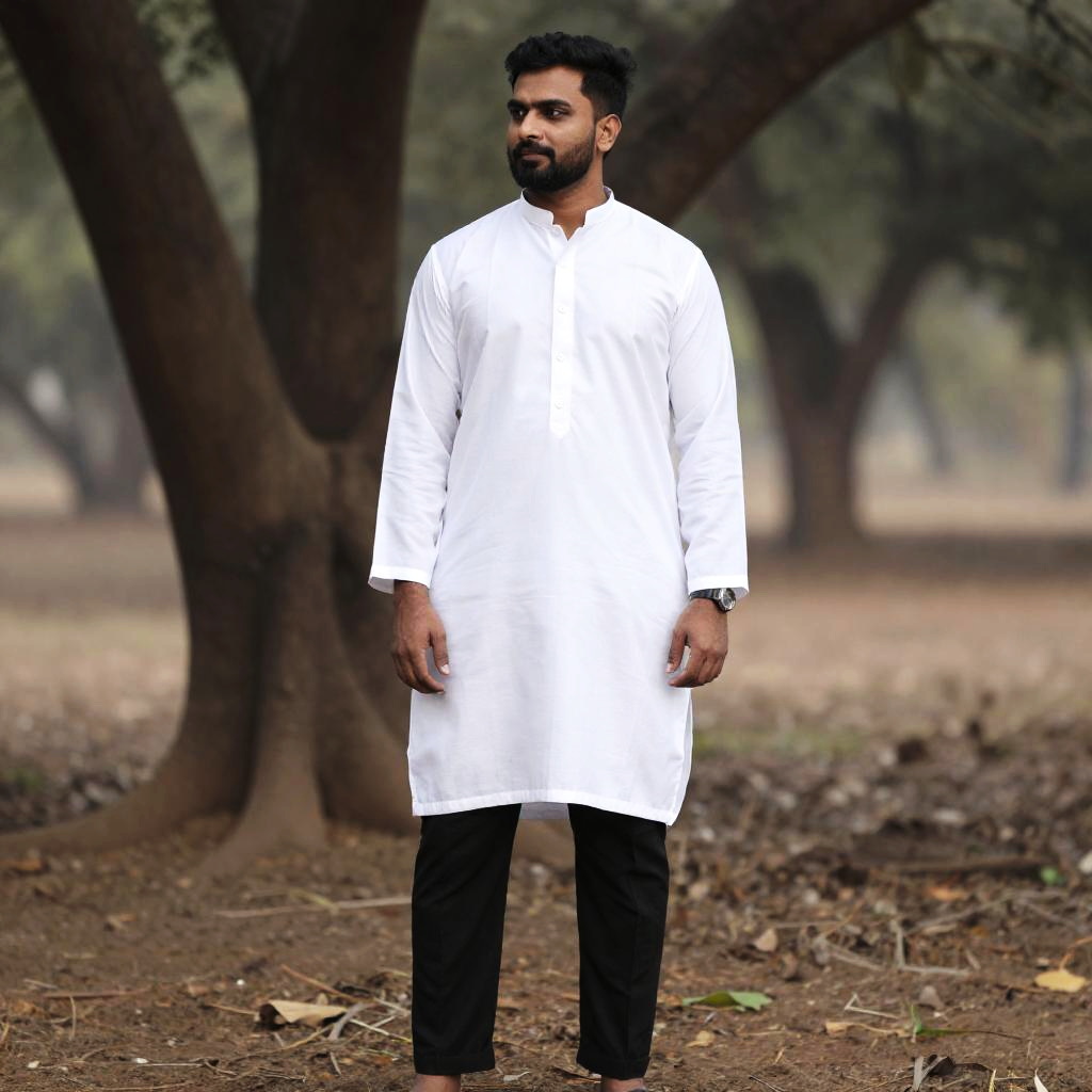 Straight Kurta Pajama, a man in a white shirt and black pants standing in front of a tree
