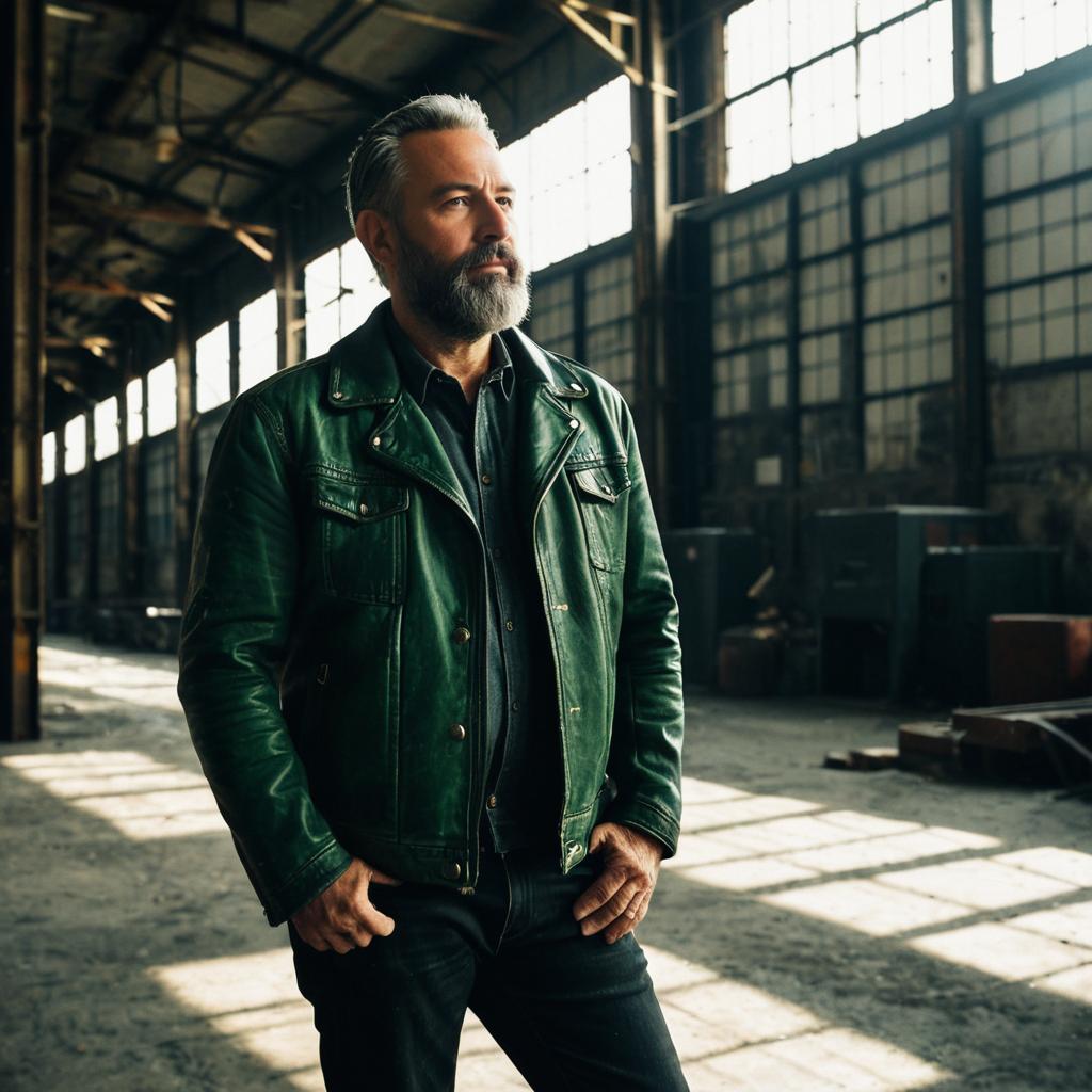 A middle-aged man with salt-and-pepper beard wearing a dark green leather jacket and black jeans leaning against an old industrial warehouse with exposed steel beams and scattered sunlight filtering through dusty windows, with cinematic depth of field, photorealistic textures, and subtle film grain.