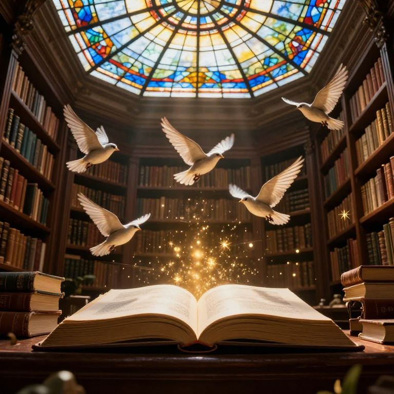 In a serene library where sunlight filters through a stained-glass ceiling, birds soar gracefully among shelves of ancient tomes, while an open book radiates golden light, seemingly summoning the birds to dance in its ethereal glow.
