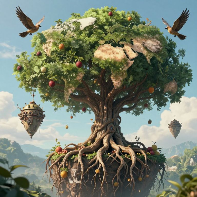 The world tree's roots stretch not underground, but into the sky, anchoring floating continents while fruits grow into steampunk birds that never land.