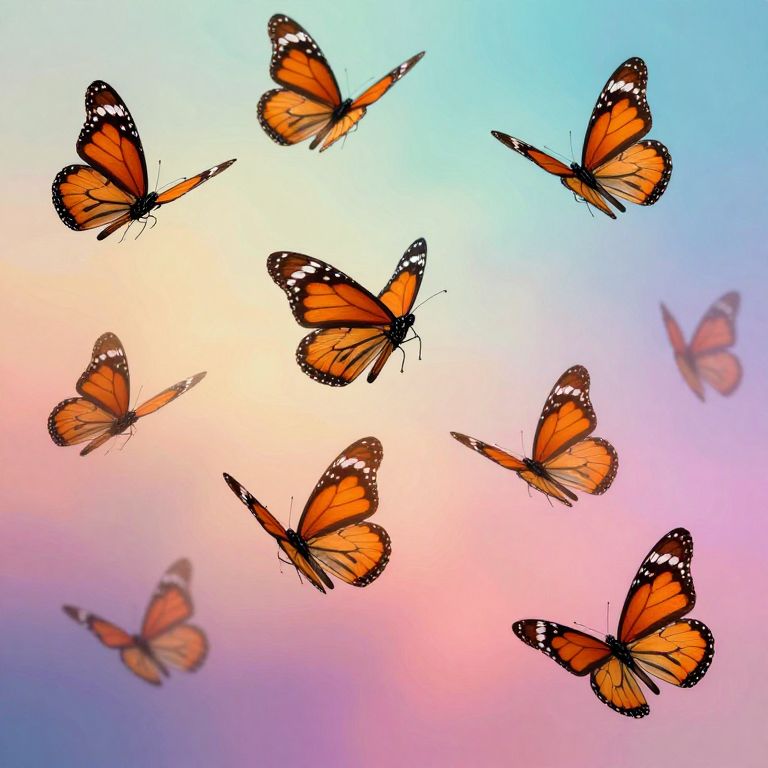 A vibrant digital artwork depicts a swarm of translucent monarch butterflies, their orange and black wings shimmering against a dreamy, gradient backdrop, evoking a sense of ethereal movement and nostalgia reminiscent of long-lost memories.