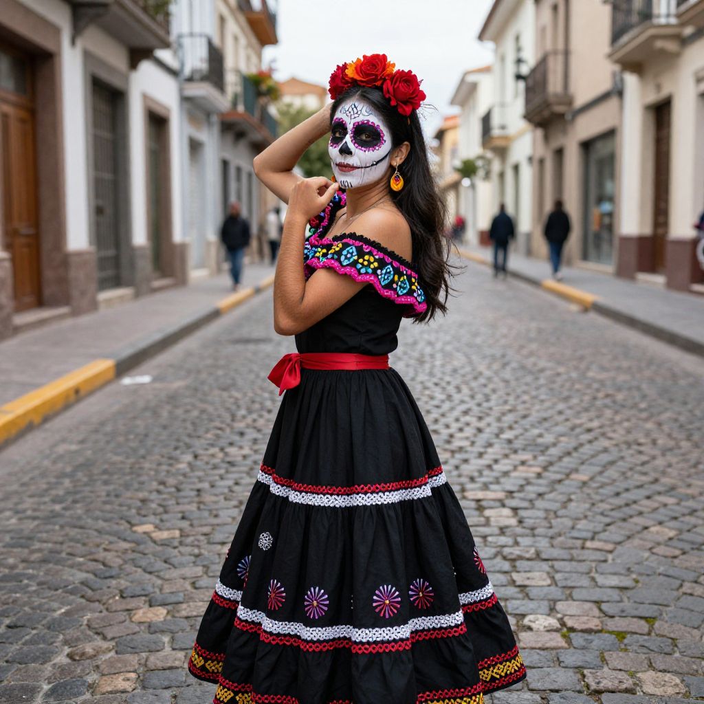 Portrait of a Latina woman dressed in traditional Day of the Dead attire with intricate skull makeup. She wears a black off-shoulder dress adorned with colorful floral embroidery, a red ribbon belt, and a floral headpiece with red roses, standing on a cobblestone street in an urban setting.