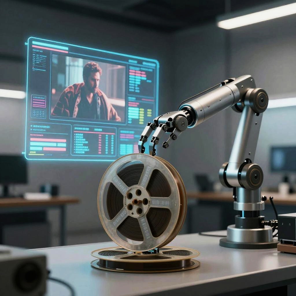 Concept art of stable video AI enhancing film quality, showcasing a robotic arm adjusting a vintage film reel while holograms display video data and real-time analytics in a modern studio setting.