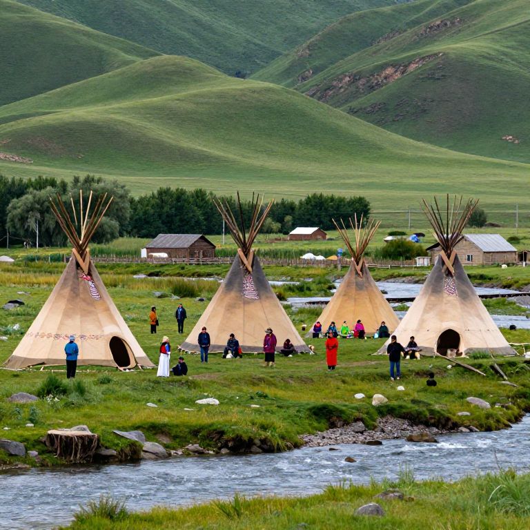 Photograph of a rural landscape featuring four traditional Native American-style teepees with conical shapes and wooden supports, arranged in a row on a grassy meadow. The teepees are made of beige canvas and have small decorative patterns. A group of people, dressed in colorful, traditional clothing, stand and gather around the teepees. In the background, rolling green hills and a line of trees are visible. A small river runs in the foreground, with rocks and grassy banks. Nearby, rustic buildings and a white tent are situated. The scene is bright with natural daylight.