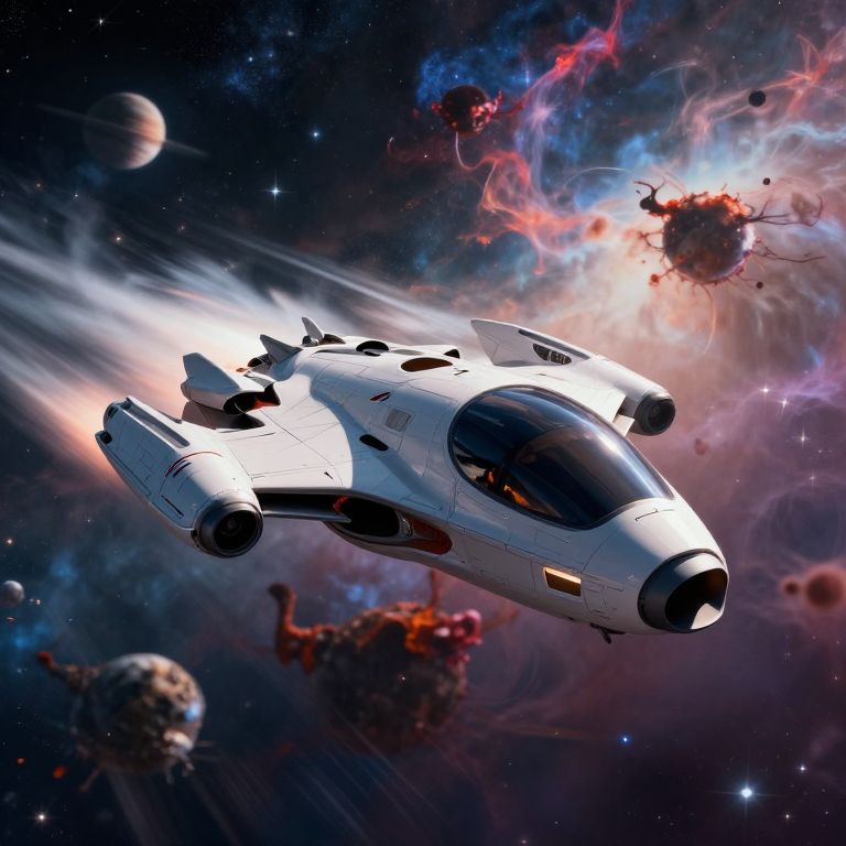 Digital illustration of a sleek, white, futuristic spaceship speeding through a colorful, star-studded galaxy with nebulae and planets in the background. Bright