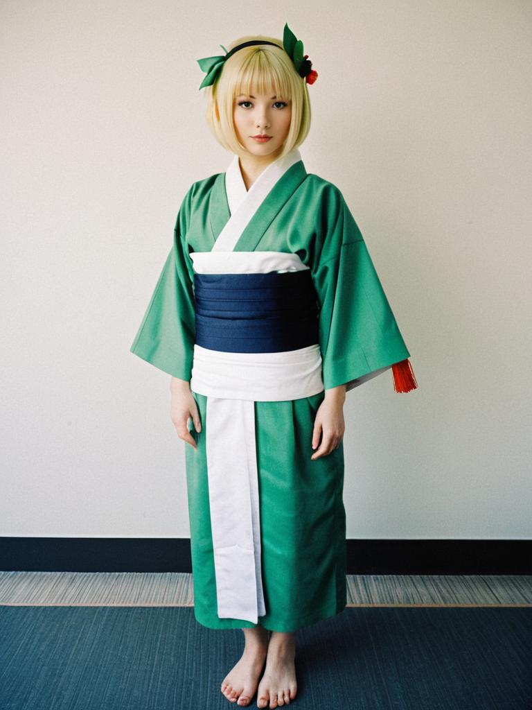Photo-realistic cosplay photo of person in moriyama shiemi costume. Full body. Standing. Full length. 1girl, green eyes, blonde hair, short hair, ahoge, hairband, kimono