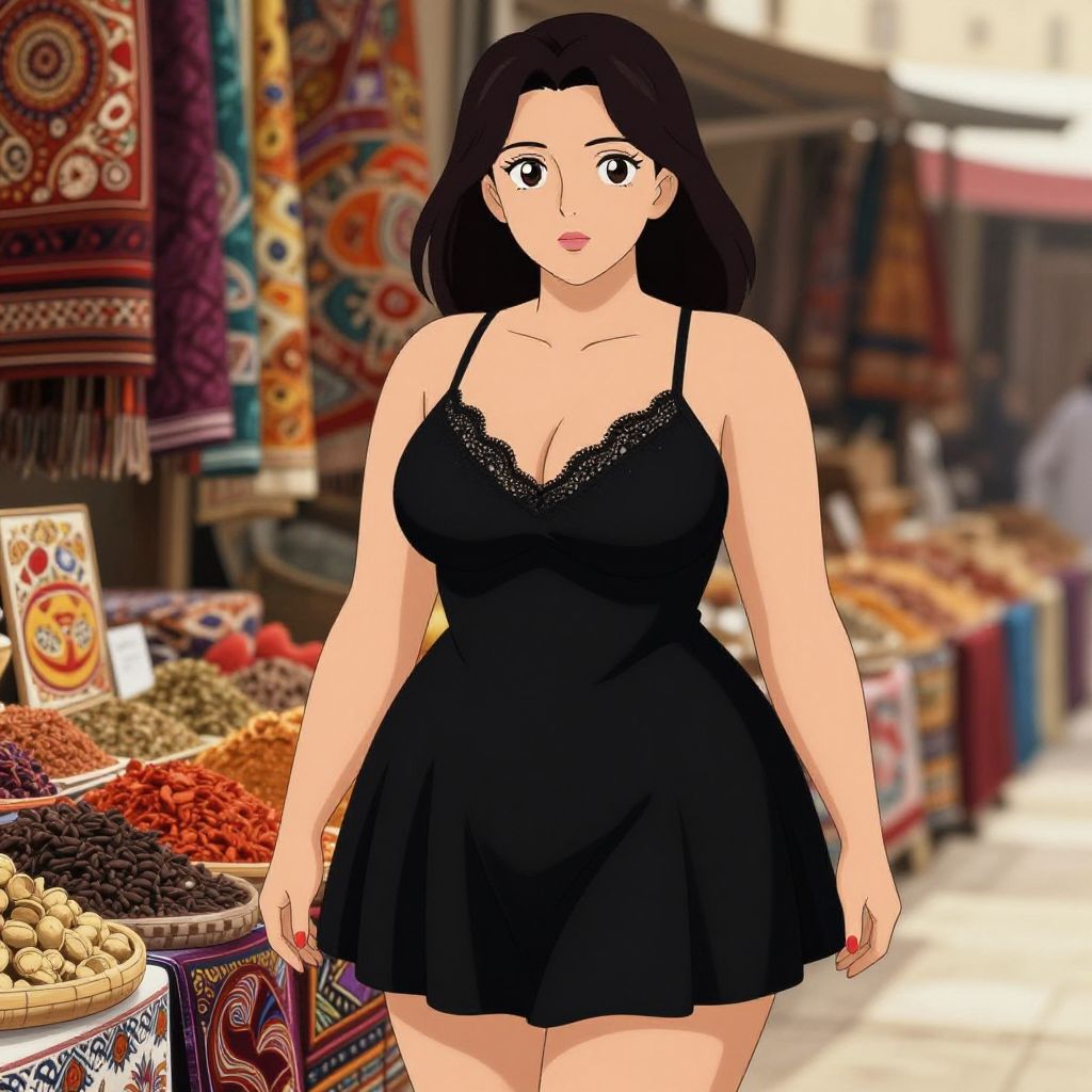A Stocky woman, in a black mini slip dress with a V-neckline and lace trim, thin spaghetti straps, and a lightly pleated skirt, stands in a vibrant Outdoor market in a Middle Eastern bazaar, surrounded by colorful textiles and spices, captured in the style of toei animation. Sexy. Pretty face and beutiful eyes Sexy. Pretty face and beаutiful eyes. Big breasts