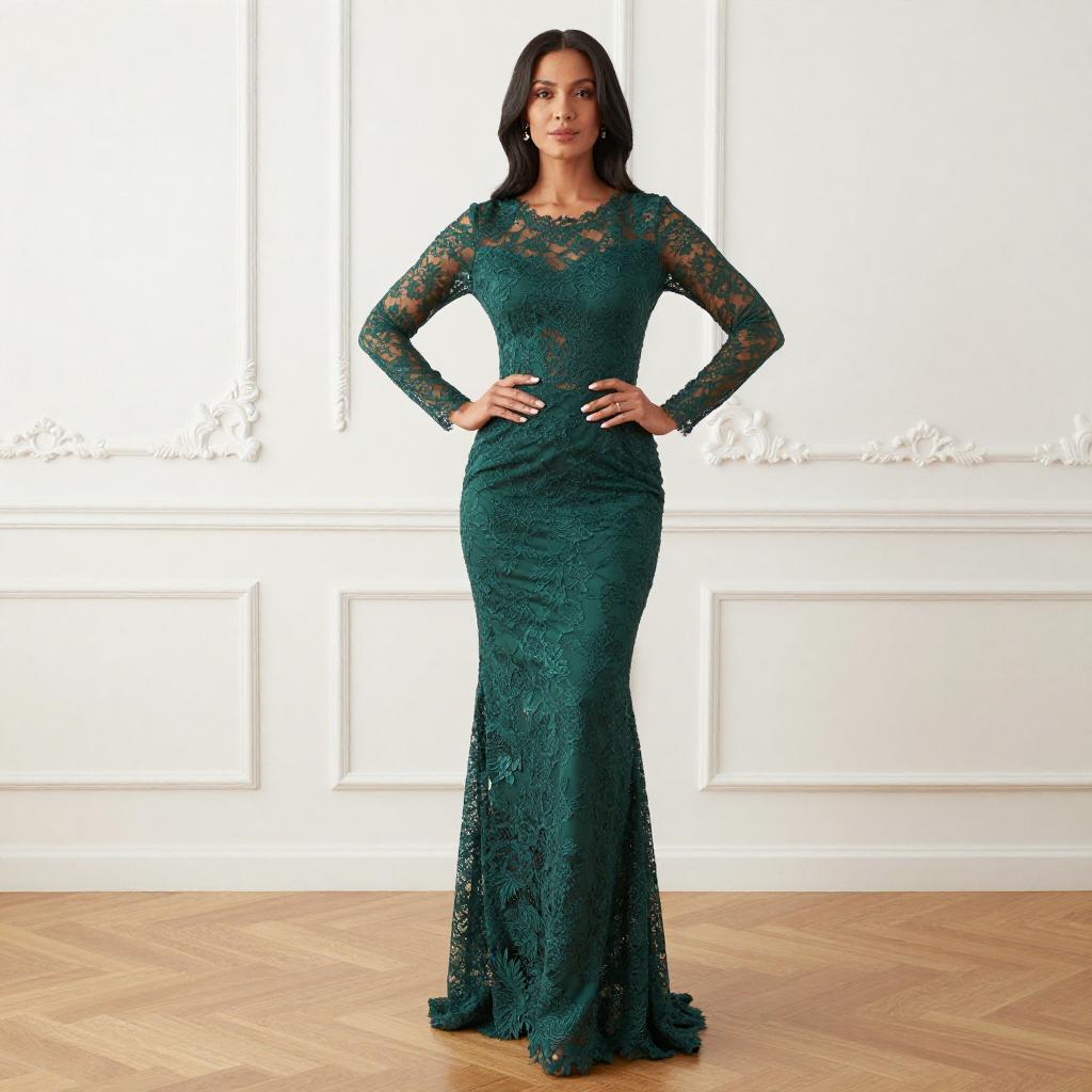 Photograph of a woman with long black hair, wearing a form-fitting, floor-length, dark green lace gown with long sleeves. She stands confidently with hands on hips, in front of a white-paneled wall with ornate detailing. The gown's lace ure contrasts with the smooth fabric of the dress, and the wooden floor adds warmth to the elegant setting.