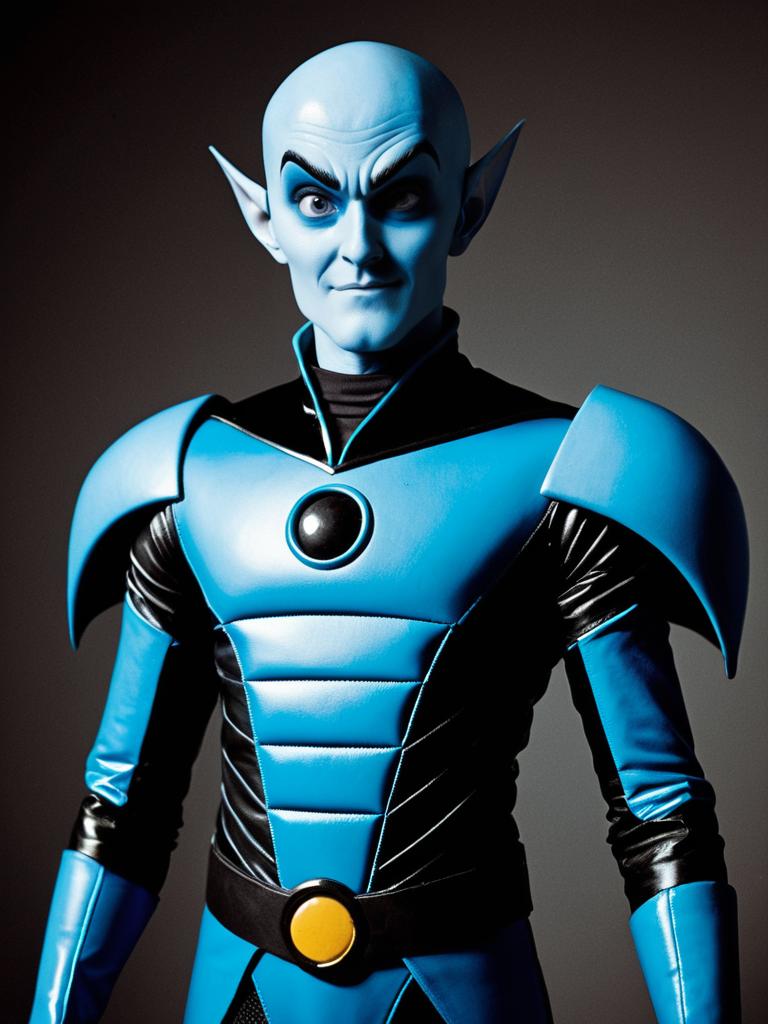 Man in Megamind costume, waist-up editorial portrait, photorealistic tones