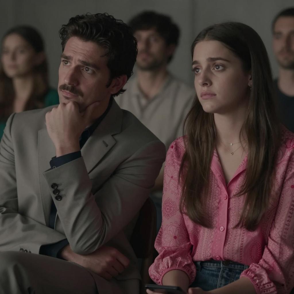 A movie theater scene. A man in a gray suit and light blue shirt sits beside a woman with long brown hair in a pink patterned blouse. Both have focused expressions. Surrounding them are other seated viewers, dimly lit. The man holds a white paper in his left hand. Five people in total. Dark background.