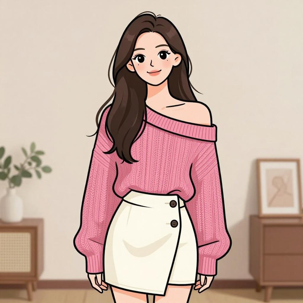Woman with pretty face and pretty hair. smiling Woman, casual chic, red and white patterned knit sweater, crew neck, long sleeves, black A-line mini skirt, zip front, patch pockets, white low-top sneakers, quilted white crossbody bag, no visible jewelry, plain indoor background. --sref 1467