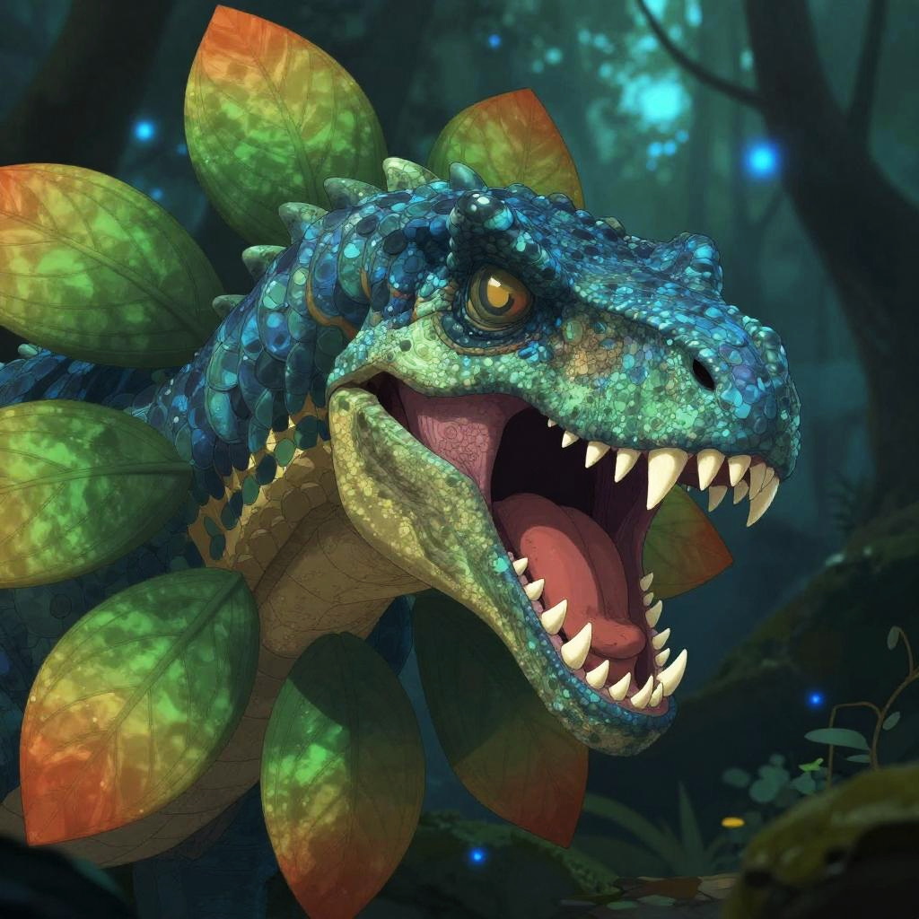 Digital art of a vibrant, blue-green, leaf-headed dinosaur with sharp teeth, glowing yellow eyes, and colorful, translucent leaves in a dark, magical