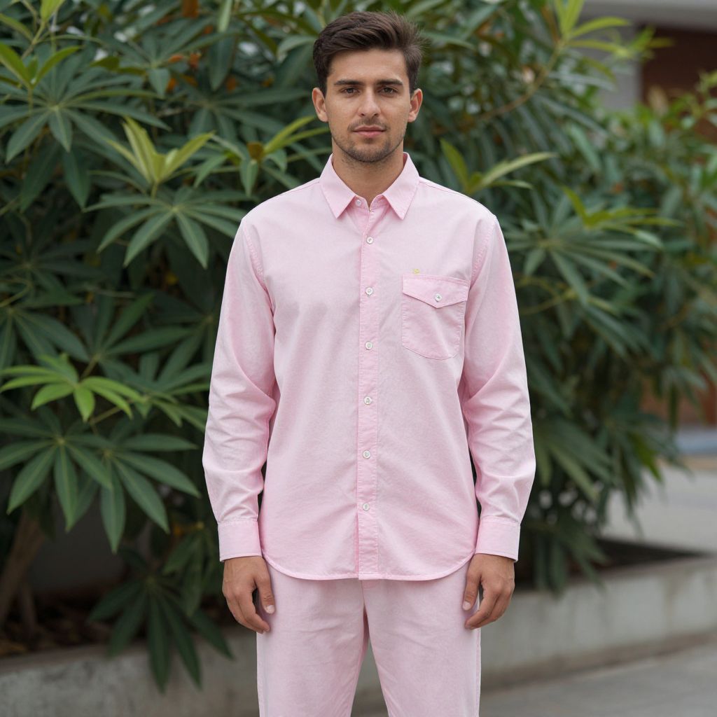 Photograph of a young man standing outdoors against a backdrop of lush green foliage. He has short, dark brown hair and a light beard. He wears a long-sleeved, button-up, pink shirt with a chest pocket, paired with pink pants. His expression is neutral, and he stands with his arms relaxed by his sides. The background includes large, dark green leaves, and there is a blurred, gray concrete wall partially visible on the right. The lighting is natural, highlighting the soft pink color of his outfit.