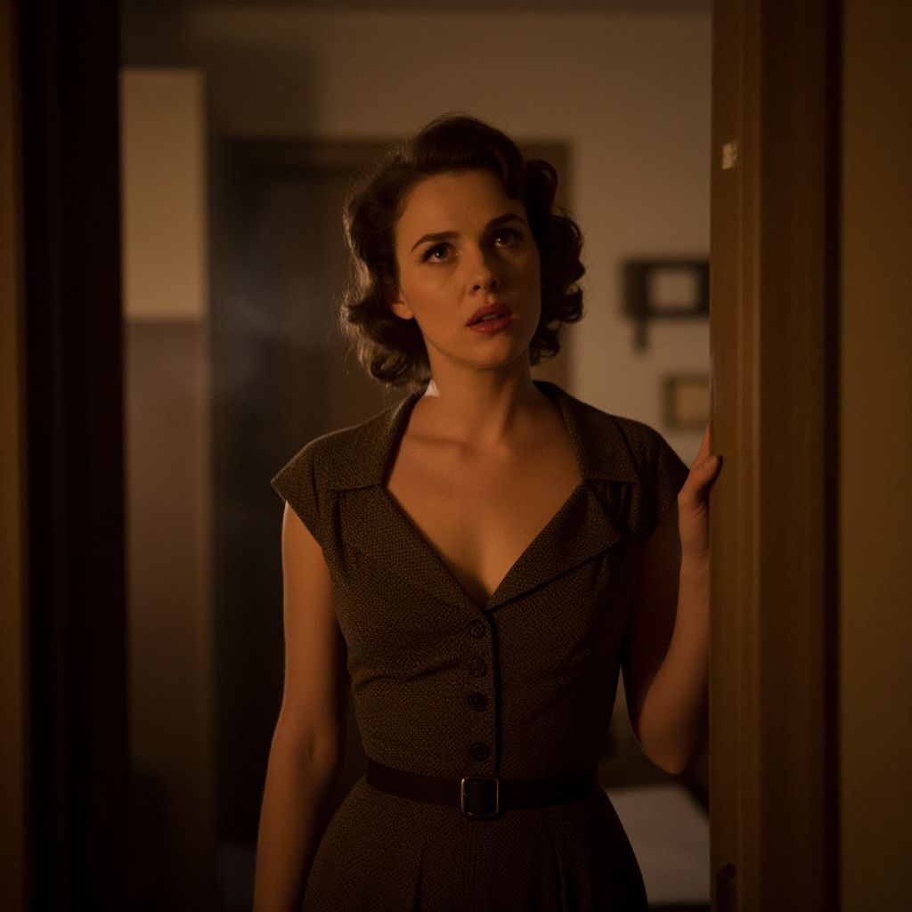 Prostitute movie scene inside a vintage 1950s urban apartment, dimly lit with warm tones, a woman in elegant but worn clothing, expressive face showing complexity, moody atmosphere with smoke and soft focus.