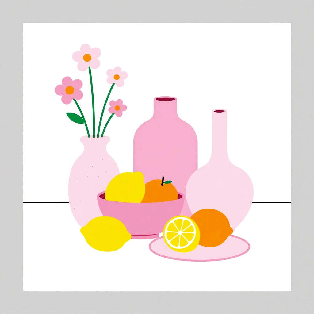 Digital minimalist still life drawing featuring three pink vases of varying shapes, one holding pink flowers with orange centers. The composition includes a bowl containing a yellow lemon and orange, alongside a sliced lemon on a pink plate. The background is white with a subtle grey border, emphasizing the colorful and clean design.
