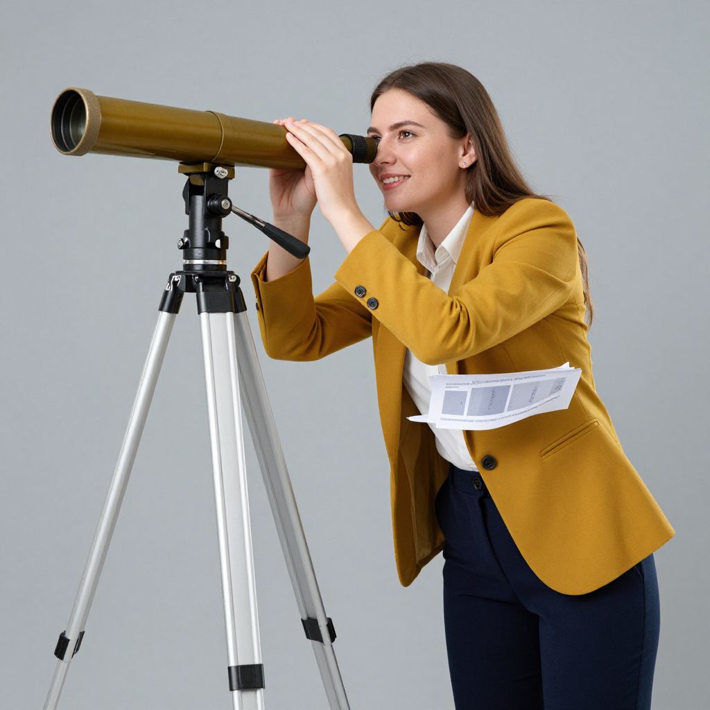Businesswoman in a mustard blazer and navy trousers stands beside a tripod-mounted document, smiling as she peers through a golden telescope, symbolizing her focused search for opportunities.