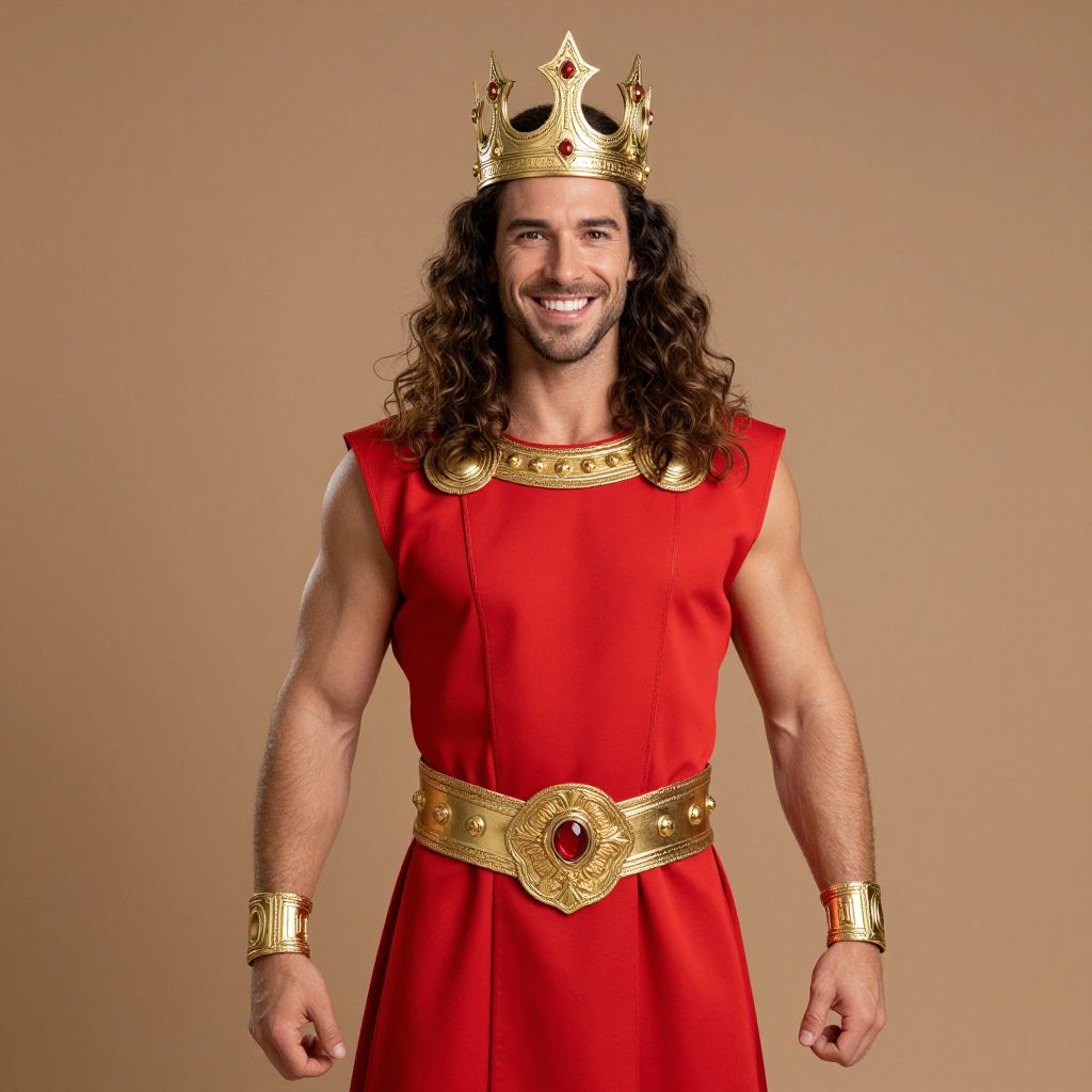 Photograph of a smiling man with long, curly brown hair wearing a gold crown and a red, sleeveless tunic adorned with a wide, ornate gold belt and matching gold cuffs. His skin is light, and he has a trimmed beard. The background is a solid, warm beige color. The man's muscular arms are visible, and he stands with a confident, relaxed posture. The gold accessories have intricate, regal designs, adding to his king-like appearance. The image has a studio lighting setup, highlighting the subject's features and the vibrant red of his tunic.