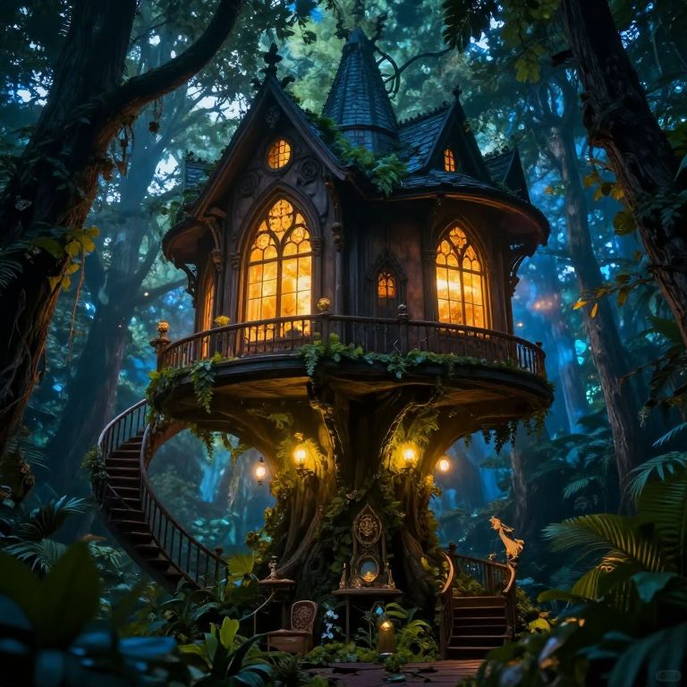 The image depicts a fantastical, mystical treehouse bedroom with Gothic revival architecture, nestled amidst a dense, vibrant forest. The treehouse, towering and intricate, is adorned with large, glowing windows that emit a warm, golden light, illuminating the interior with a dreamy ambiance. The room is filled with messy, volumetric lights that cast a soft glow, enhancing the magical atmosphere. The walls and floors are covered in lush, green foliage, blending seamlessly with the surrounding trees, creating a seamless transition between the indoor and outdoor environments. The treehouse features a series of winding stairs that lead up to various levels, each adorned with unique, ornate decorations and furniture. The overall composition is balanced, with the treehouse centrally positioned, surrounded by a rich tapestry of trees and foliage, creating a sense of depth and immersion in the mystical forest setting. The colors are rich and varied, with shades of blue, green, and gold dominating the scene, adding to the enchanting and otherworldly feel of the image.