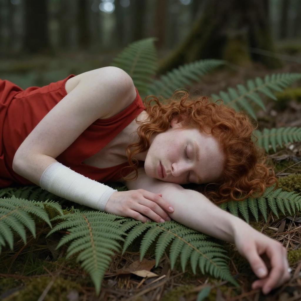 Photograph of a pale-skinned woman with curly red hair, lying on ferns in a dark forest. She wears a red sleeveless top and has a white bandage on her right forearm. Her eyes are closed, and her head rests on her left arm, which is extended above her. The background is blurred with tall trees.