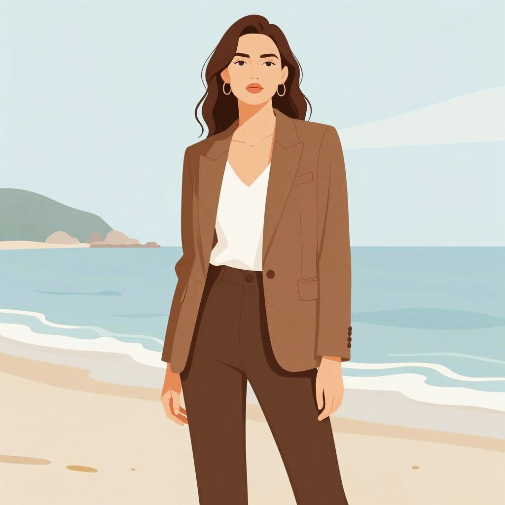 This elegant illustration features a woman standing confidently on a serene beach, dressed in a stylish brown suit. The soft color palette and smooth lines create a modern and sophisticated atmosphere, capturing a moment of tranquility by the shore.