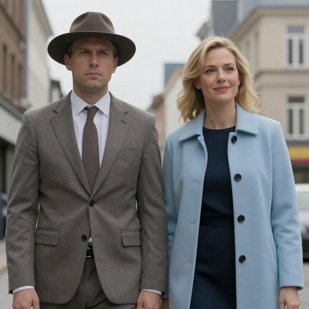 Photograph of a man and woman laughing. Woman in beige blouse and black skirt, blonde hair in a side ponytail, wearing a nurse's cap. Man in gray suit, light blue shirt, brown tie, holding a black hat. Elegant room with gold trim and a dark fireplace on the left. Both smiling, standing close together.