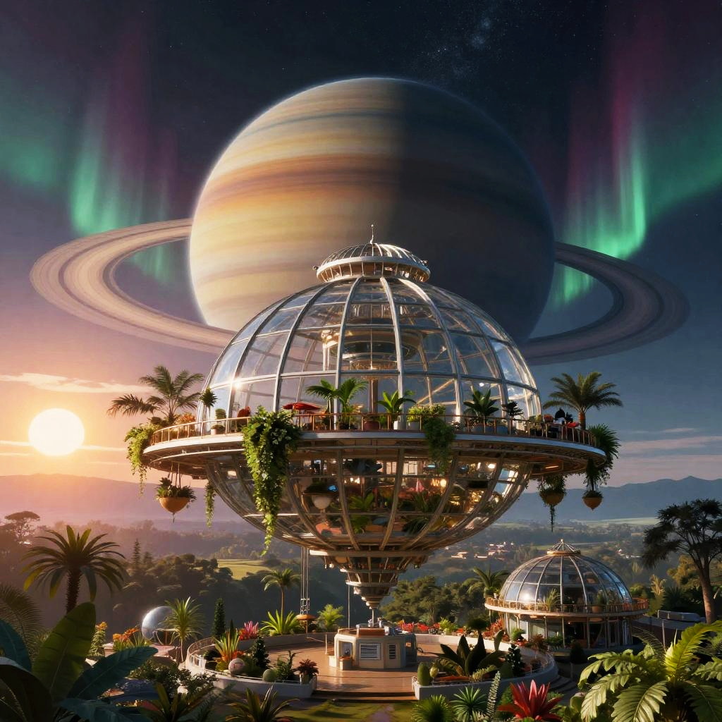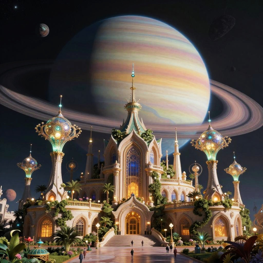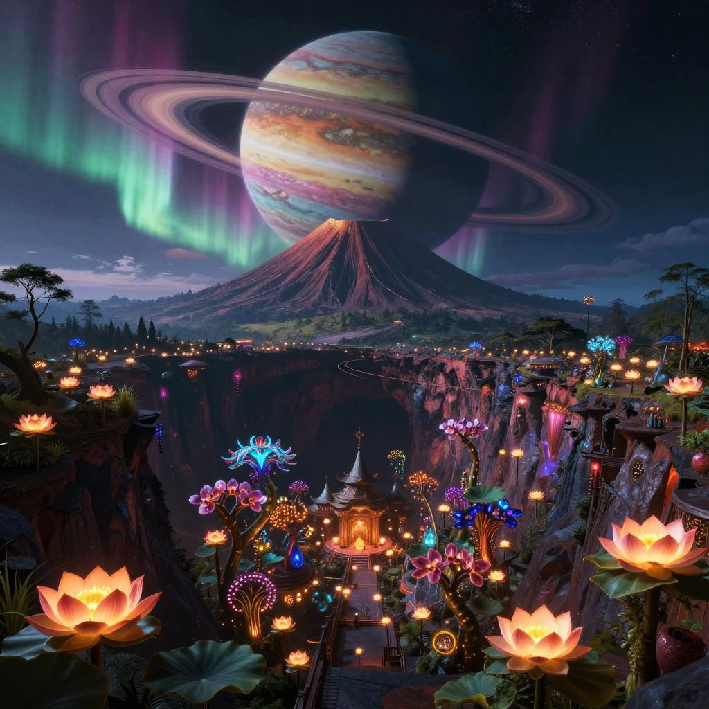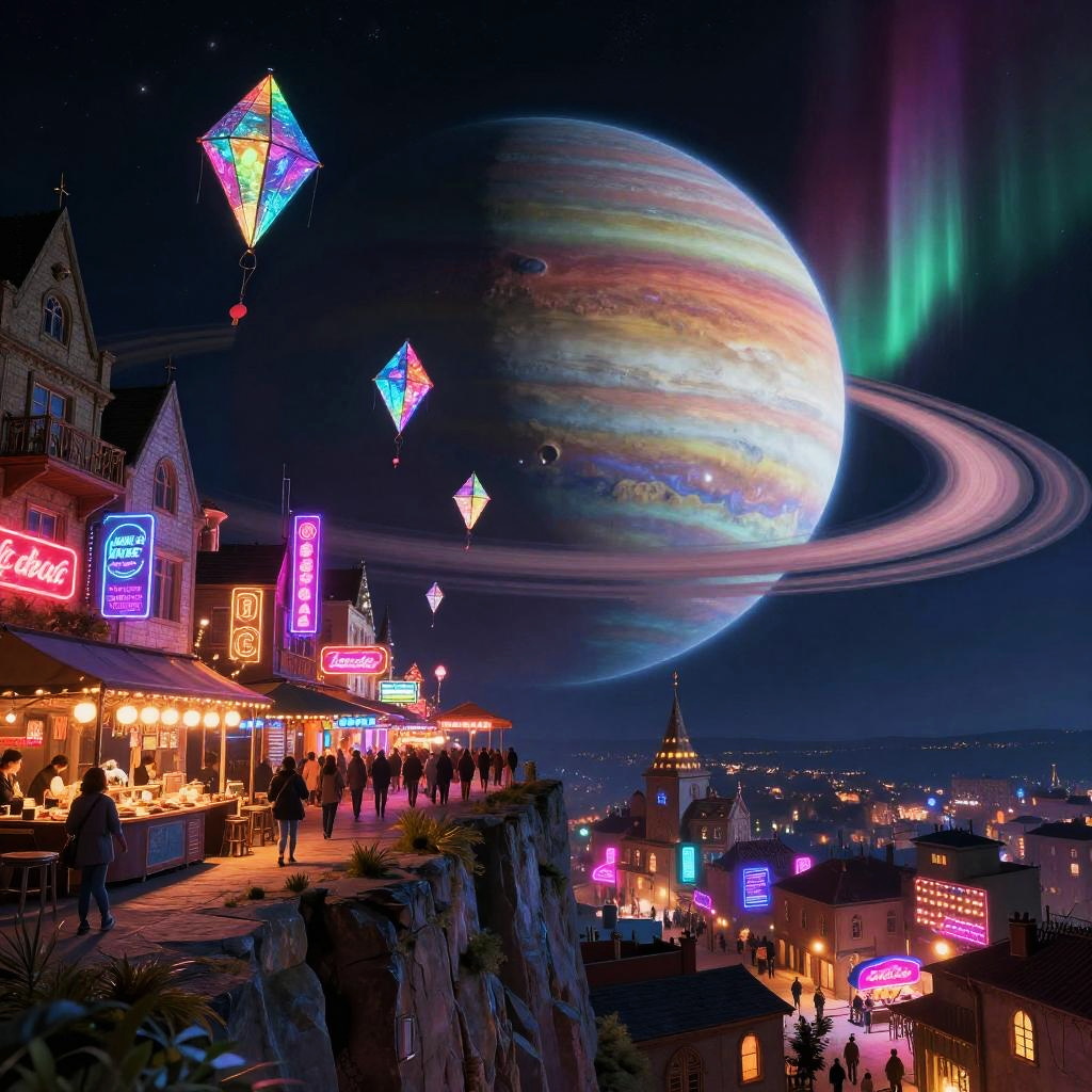 A stunning nocturnal neon bazaar city with a levitating holographic lantern kites set against a cliffside on a ringed exoplanet, featuring a vibrant backdrop of massive gas giant with shimmering polar auroras in the distance. This artwork is rich in detail, inspired by Moebius (Jean Giraud), showcasing cinematic lighting and hyperrealism, rendered in 8K.