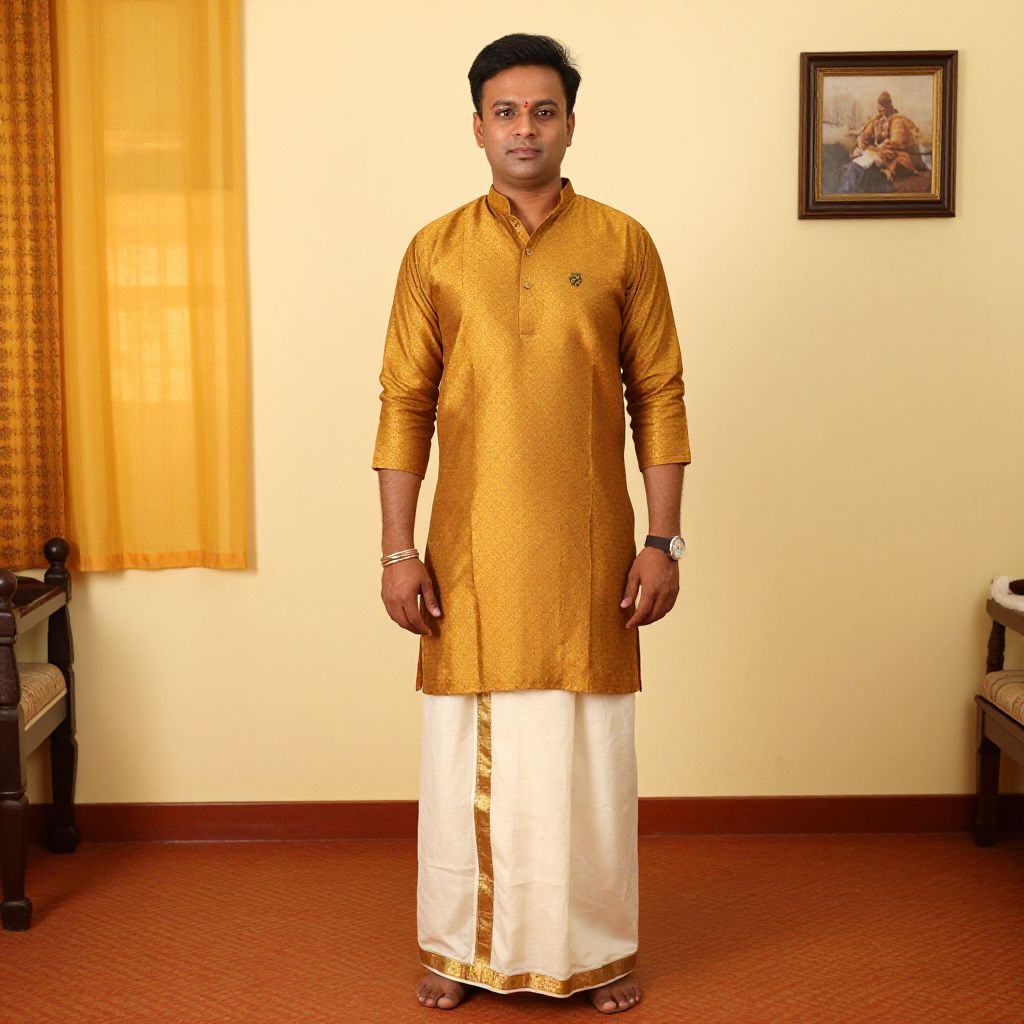 "Venkateshwara Garments, a man in a traditional costume standing in a room"