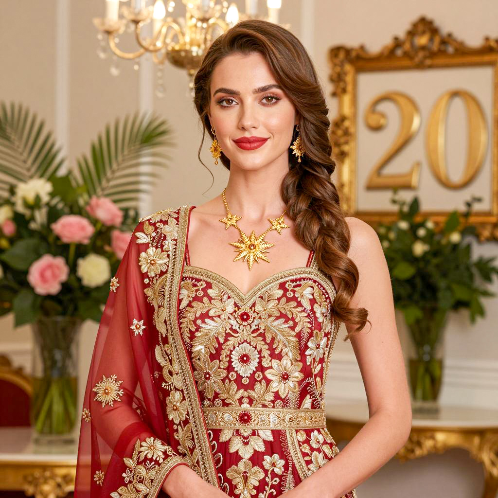 Portrait of a beautiful fair-skinned woman with brown hair styled in a loose braid, wearing a sheer red dress embroidered with intricate gold floral patterns. She accessorizes with a large gold star necklace and matching earrings. The elegant setting includes a chandelier, green plants, pink flowers, and a gold-framed number '20' in the background, creating a luxurious and romantic atmosphere.