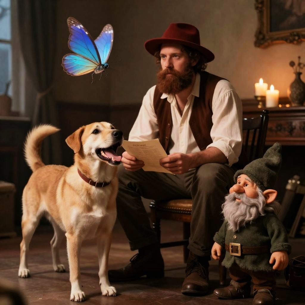 Photograph of a bearded man in a red hat and white shirt with a brown vest, holding a piece of paper. A tan dog with a wide mouth stands to his left. A blue fairy with translucent wings hovers above. A gnomish creature with a beard and green shirt crouches on the right. Cozy, dimly lit room with wooden furniture and candles in the background.