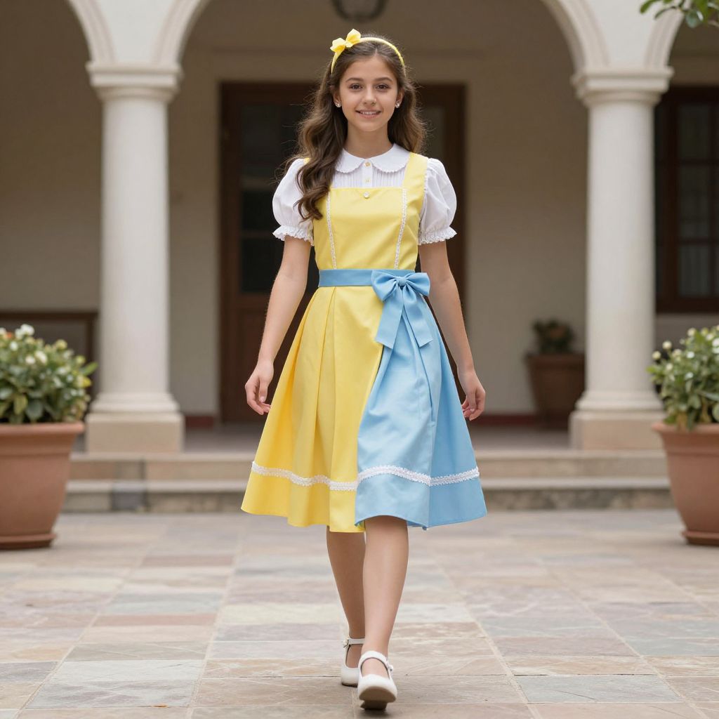 Photograph of a young girl with long brown hair and fair skin, wearing a yellow and light blue pinafore dress with a white collar and short sleeves. The dress features a large blue bow on the right side. She also wears white Mary Jane shoes and a yellow hairbow. The background shows a tiled courtyard with two large potted plants on either side and white arches with a dark wooden door. She is walking confidently towards the camera with a gentle smile. The overall style is reminiscent of a classic, vintage look.