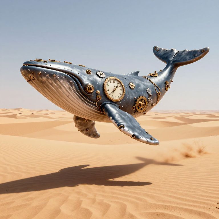 Photorealistic CGI of a clockwork whale with gears and clocks floating in a desert with orange sand dunes. Bright blue sky. Whale's metallic