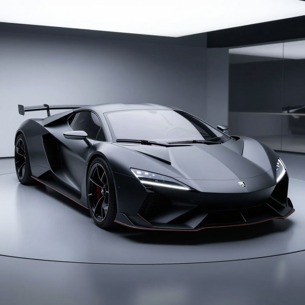 Ai car design generator rendering a concept sports car with sharp angular features, low profile, matte black body, advanced robotics elements integrated, displayed in a modern design studio environment, digital art style.