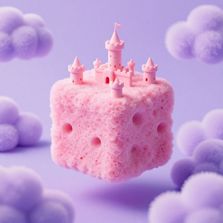 This digital CGI image features a pink, cube-shaped floating castle with a fluffy, textured surface, resembling cotton candy. The castle has multiple small turrets and a central flagpole with a tiny flag. The background is a soft gradient of purple and blue, dotted with large, fluffy white and purple clouds. The cube has multiple circular holes, adding to its whimsical appearance. The overall style is surreal and fantastical, with a pastel color palette and a dreamy, ethereal atmosphere. The image has a playful and magical feel, emphasizing the enchantment of the floating castle.
