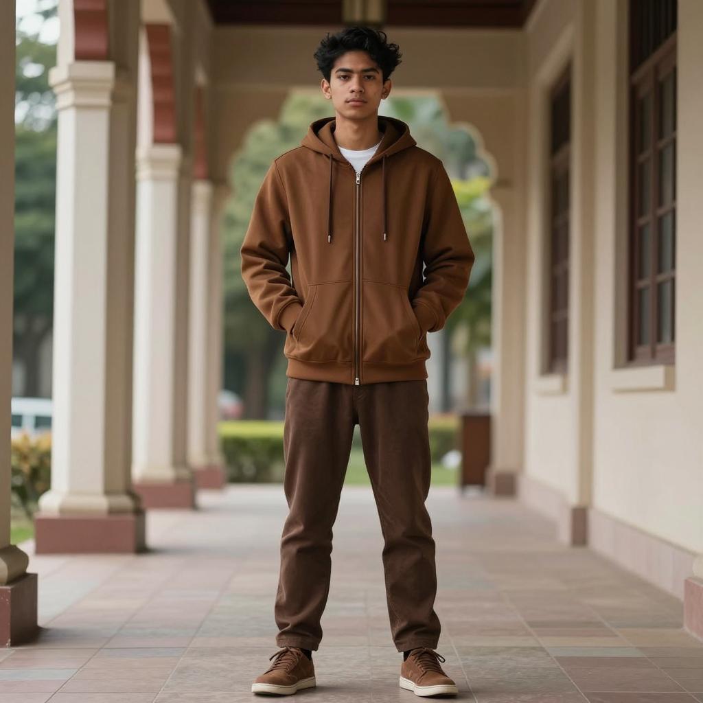 Full black outfit man, photograph of a young man standing on a tree-lined sidewalk, daytime, summer, wearing a black hoodie with hood up, black slim-fit jeans, black shoes, hands in pockets, medium skin tone, short dark hair, slightly smiling, green trees and bushes in background, paved pathway with fallen leaves, realistic style, casual streetwear, urban park setting