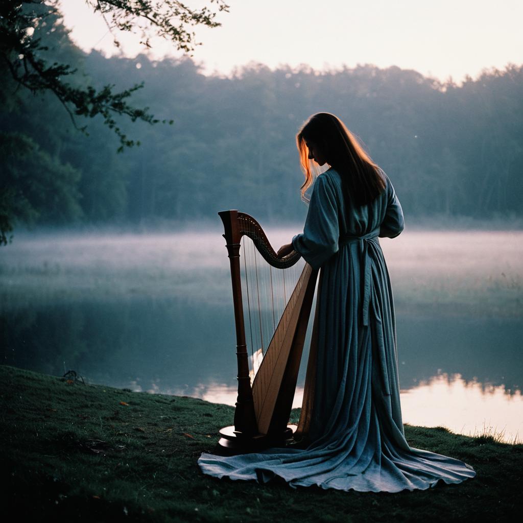 Chiaroscuro art photo taken with Fujifilm Velvia 50 analog film of a harpist plucking strings delicately, garbed in a flowing silver robe, beside a misty lake at dawn with diffused natural light, rich contrasts and glowing colors, emotional and atmospheric feel.