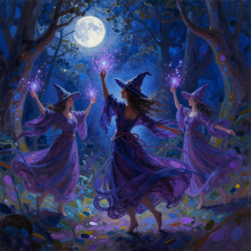 Witches dancing painting, vibrant and mystical scene of ethereal witches twirling under a full moon in an enchanted forest, flowing robes and sparkling magical energy, ethereal brushstrokes in rich blues and purples, fantasy art style.