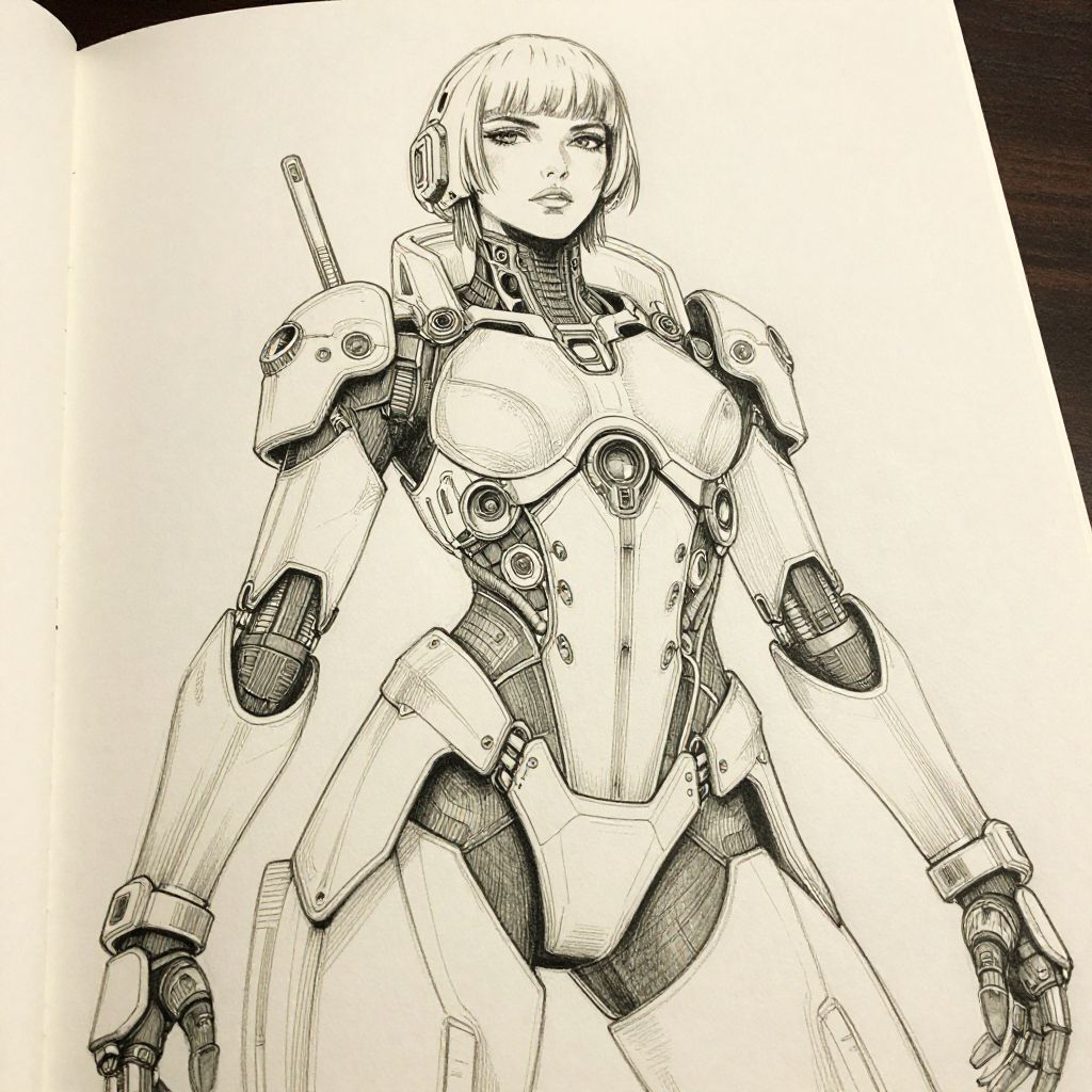 A detailed, ultra-low angle sketch of a cyberpunk woman in futuristic armor, with intricate line work and natural lighting, reminiscent of the styles of Enki Bilal, Atey Ghailan, and Ayami Kojima.