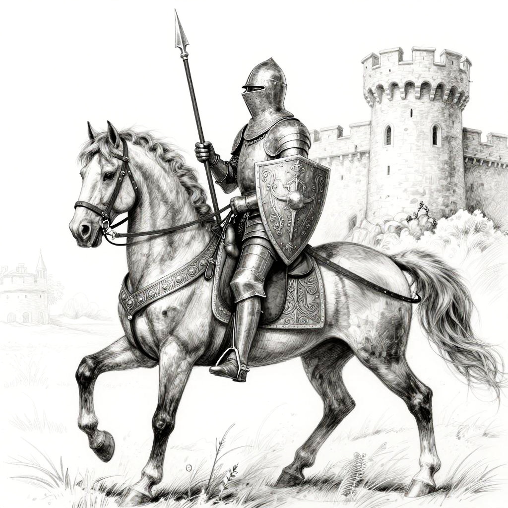 Monochrome digital drawing of a armored knight riding a galloping horse, surrounded by soldiers with flags in a stormy battlefield.