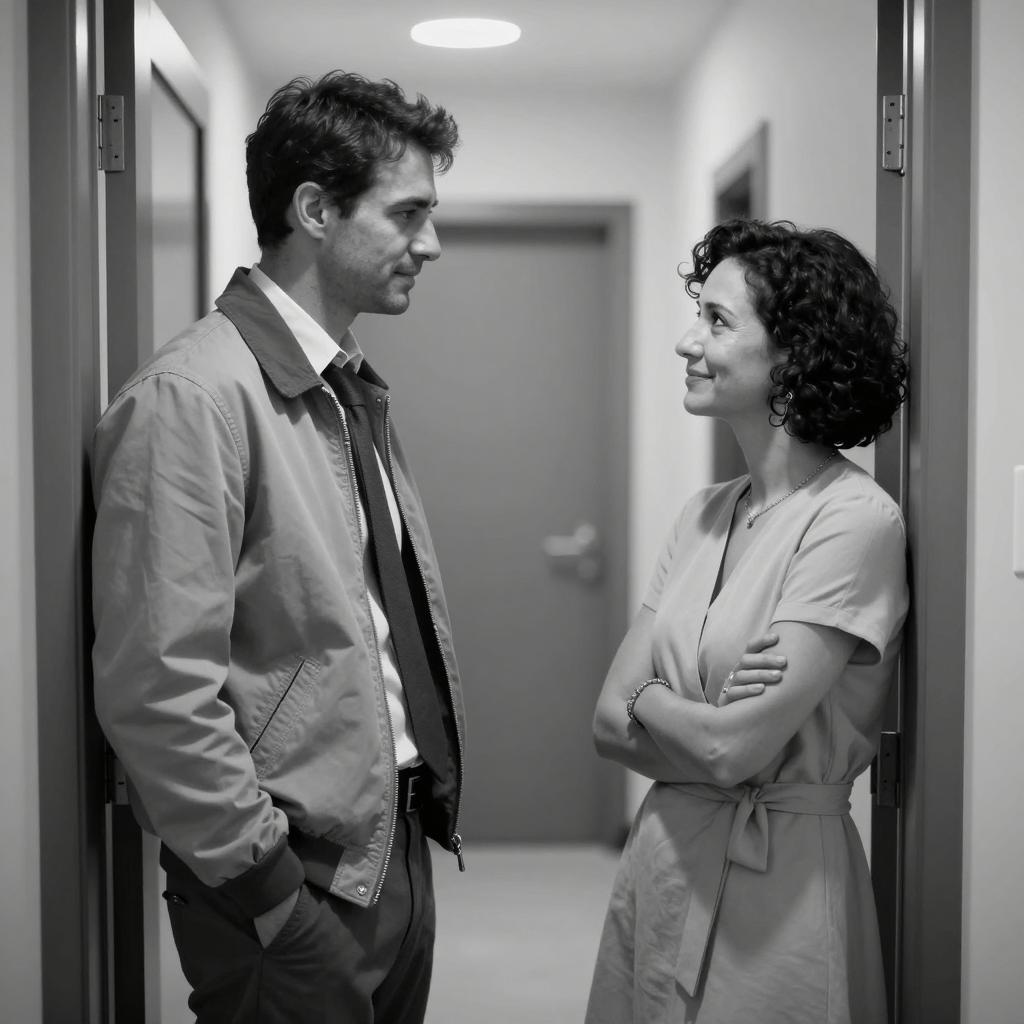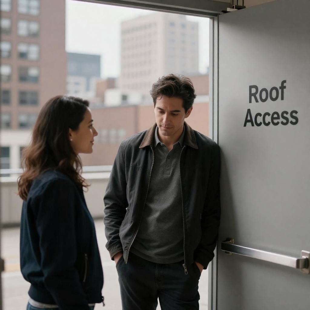 Photograph of two people standing near a building door. Man with dark hair, wearing dark jacket and gray shirt, looks down. Woman with brown hair, wearing dark jacket, smiles at him. Cityscape with tall buildings in background. Door on right, labeled "Roof Access". Man stands slightly behind woman, door handle visible.
